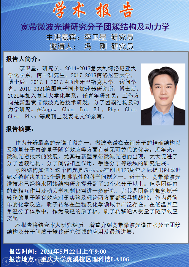 宽带微波光谱研究分子团簇结构及动力学 李卫星研究员