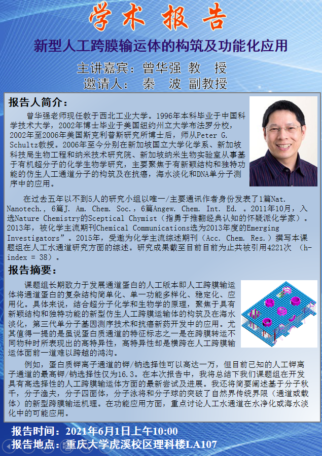 新型人工跨膜输运体的构筑及功能化应用 曾华强教授
