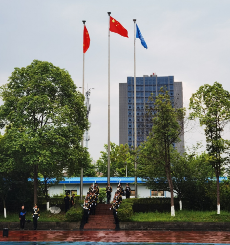 随着“升国旗,奏国歌”的口令,嘹亮的国歌声响起,鲜艳的红色缓缓上升至杆顶,五星红旗在微风中飘扬。虽然是雨天,同学们却主动收起雨伞,全体肃立行注目礼,并高唱国歌,由衷地表达自己对祖国的热爱和敬意。