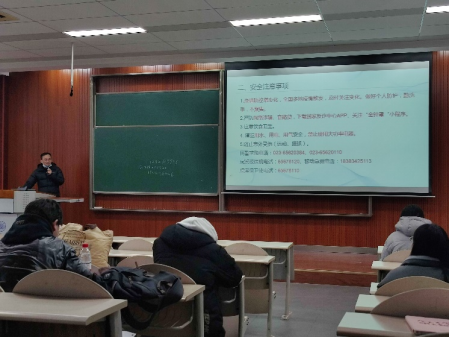会上,陈老师回顾了过去一学期的主要工作,安排了近期工作,提醒还未开始毕设的同学要及时联系毕业设计老师商讨毕设计划,尽快完成开题报告。天气渐冷,希望同学注意用水、用电、用气安全,不使用大功率电器,及时下载国家反诈中心APP,关注“金钟罩”小程序,严防网络电信诈骗。由于元旦假期临近,陈老师还叮嘱同学们要遵守学校相关规定,在校在渝过节,非必要不离校。