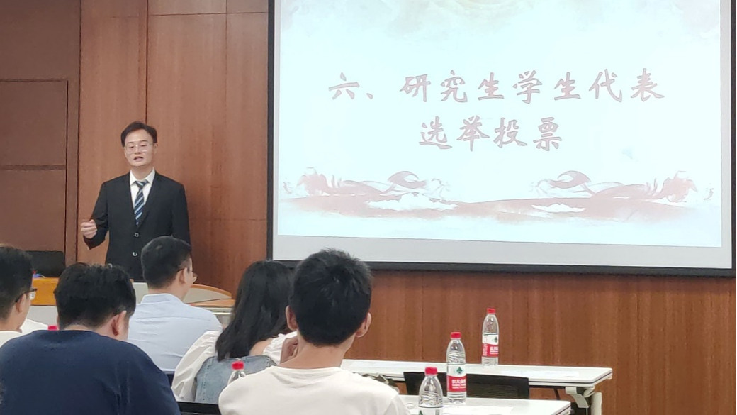 第二阶段,选举重庆大学第七次研究生代表大会的与会人员。本次会议选举名单采用自荐和他荐的形式产生,候选人包括柳冠宇、赵童、刘禹嘉等共十名研究生,由监票人谢寒露宣读大会选举办法,由主持人柳冠宇介绍各选举人员简介。与会代表以无记名投票方式选举产生了最终人选,分别是:柳冠宇、赵童、刘禹嘉、刘一帆、罗云川、刘爱迪、马侑才、姚远。